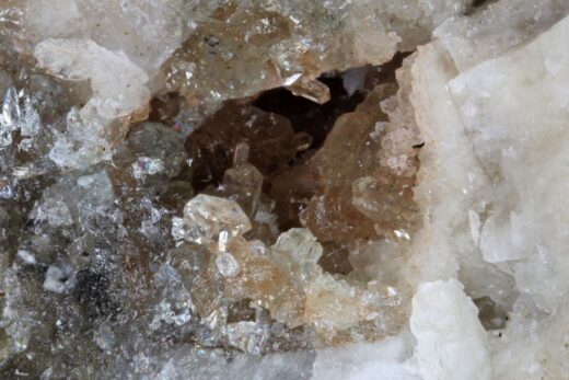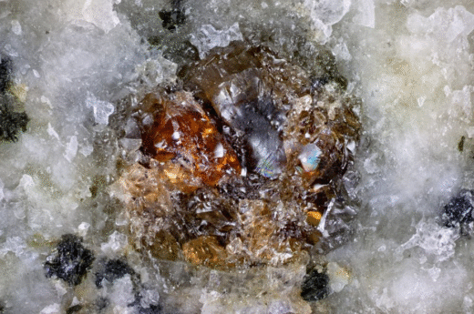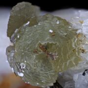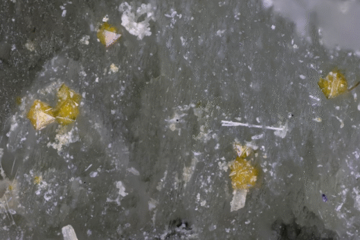Formula: ZnS Sphalerite is one of the most abundant sulphide minerals at Mont Saint-Hilaire. Colours include yellow, green, brown, red, orange, black or colourless, and range in size from a millimetre or less, up to several centimetres. It can be found in well-formed tetrahedral, pseudo-octahedral, dodecahedral, and twinned crystals.