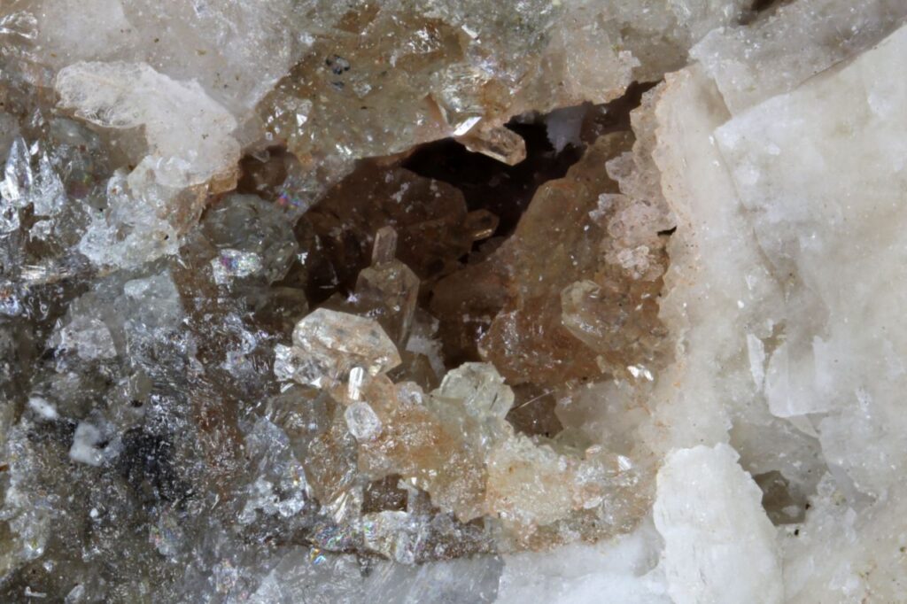 Colourless to greyish, and pinky-orange crystals of ancylite-(Ce)/calcioancylite-(Ce), with albite, aegirine, and burbankite. Width of view 3mm. Steve Sorrell specimen and photo.