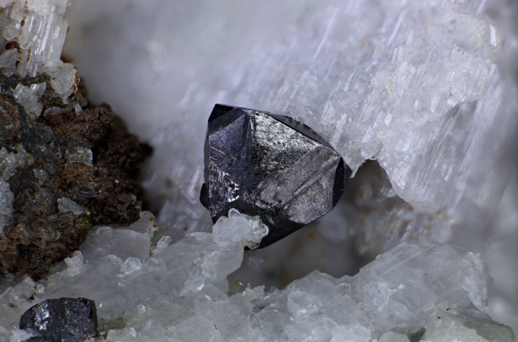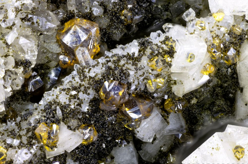 Sphalerite is one of the most abundant sulphide minerals at Mont Saint-Hilaire. Colours include yellow, green, brown, red, orange, black or colourless, and range in size from a millimetre or less, up to several centimetres. It can be found in well-formed tetrahedral, pseudo-octahedral, dodecahedral, and twinned crystals.